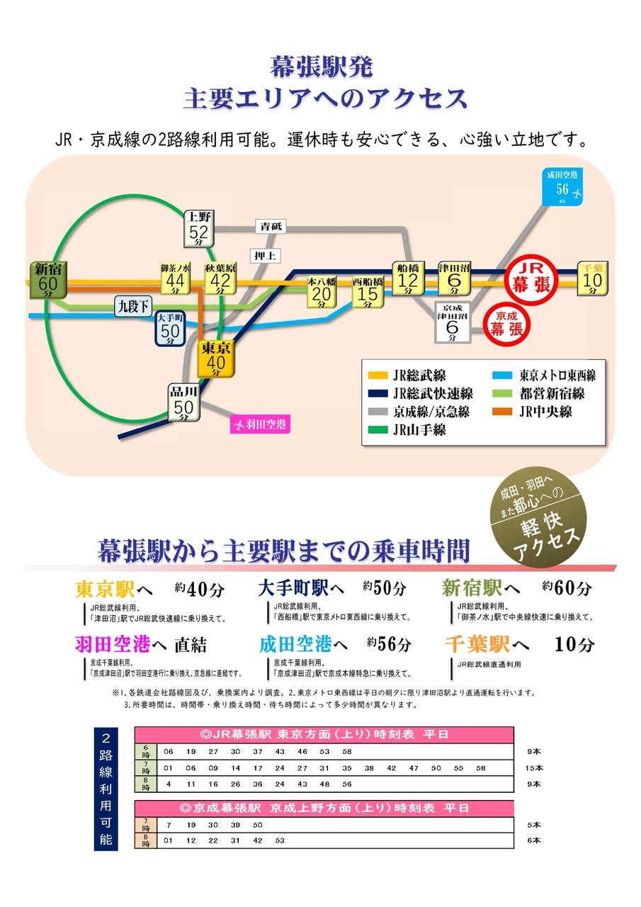 【幕張駅からのアクセス】 都心や空港方面へ快適アクセス。 京葉道路「武石IC」、東関東自動車道「湾岸習志野IC」利用可能。 海辺の九十九里、緑豊かな久留里も1時間圏内。 都市と自然を自在に愉しむ、幕張というロケーション。