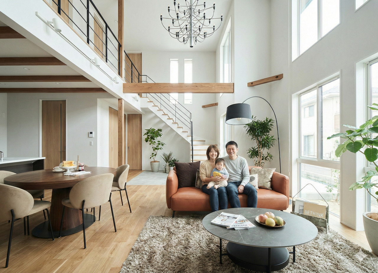「吹き抜けが描く、ゆとりのある暮らし」 大きな吹き抜けと高窓から降り注ぐ自然光。家族をやさしく包み込む開放的なLDK。上質で洗練された空間は、家族が自然と集まる心地よい場所に。