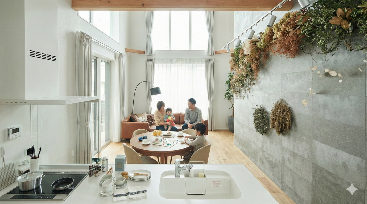 「光と緑に包まれる、家族のリビング時間」 大きな吹き抜けからやわらかな自然光が差し込む、開放感あふれるLDK。キッチンからリビングまで一直線に広がる空間には、木の温もりと上質なインテリアが調和しています。