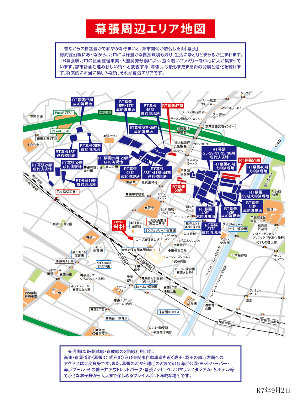 | 交通 | 総武線「幕張」駅徒歩10分〜11分 京成千葉線「京成幕張」駅徒歩13分〜14分 京成千葉線「検見川」駅徒歩22分〜23分 |